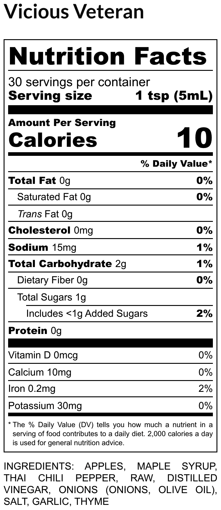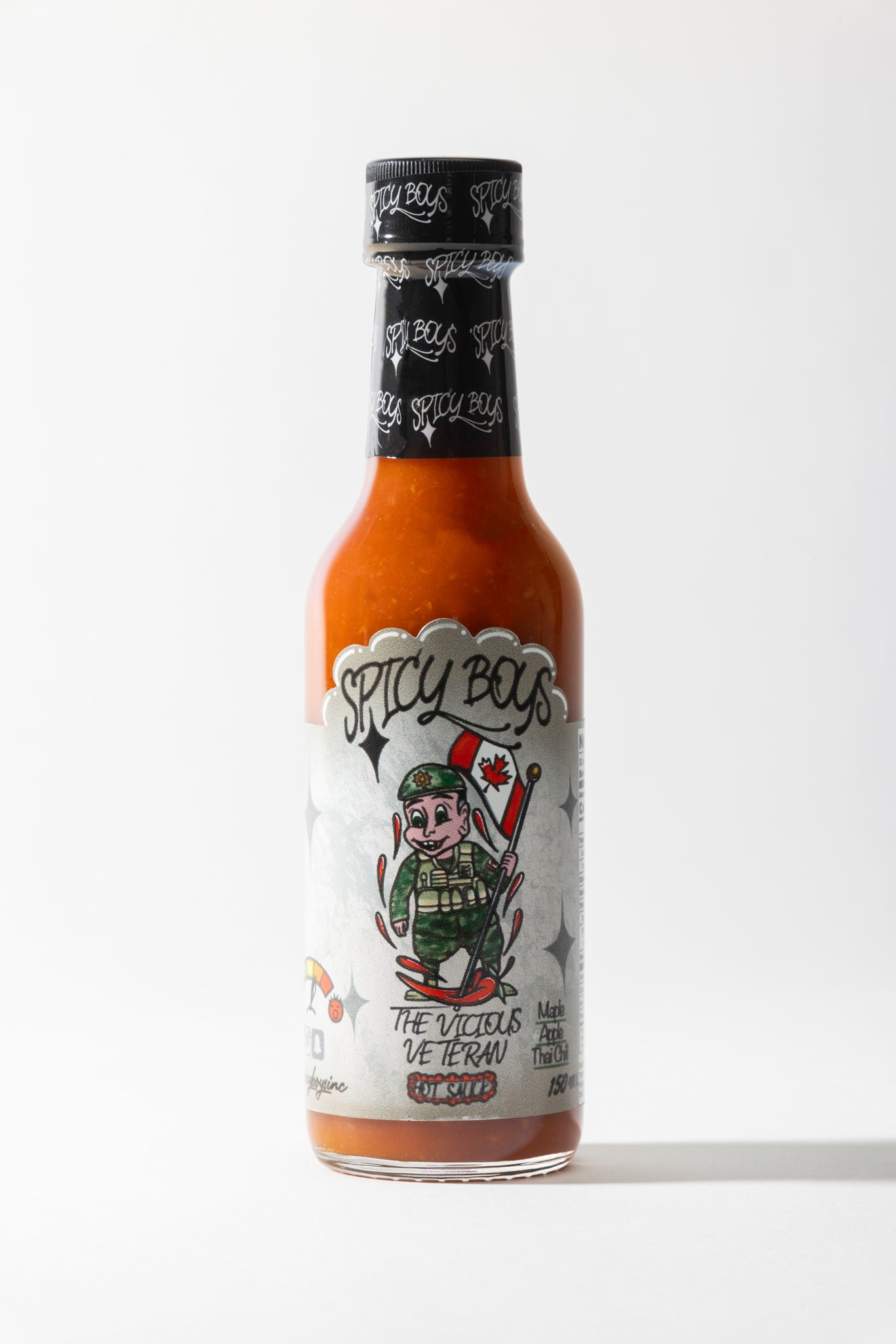 Vicious Veteran blends Canadian maple sweetness with crisp apple and the clean, lingering heat of Thai chilies to create a sauce that’s powerful without being reckless. Smooth up front, steady in the middle, and decisive on the finish — this is a medium-heat sauce that earns its reputation.